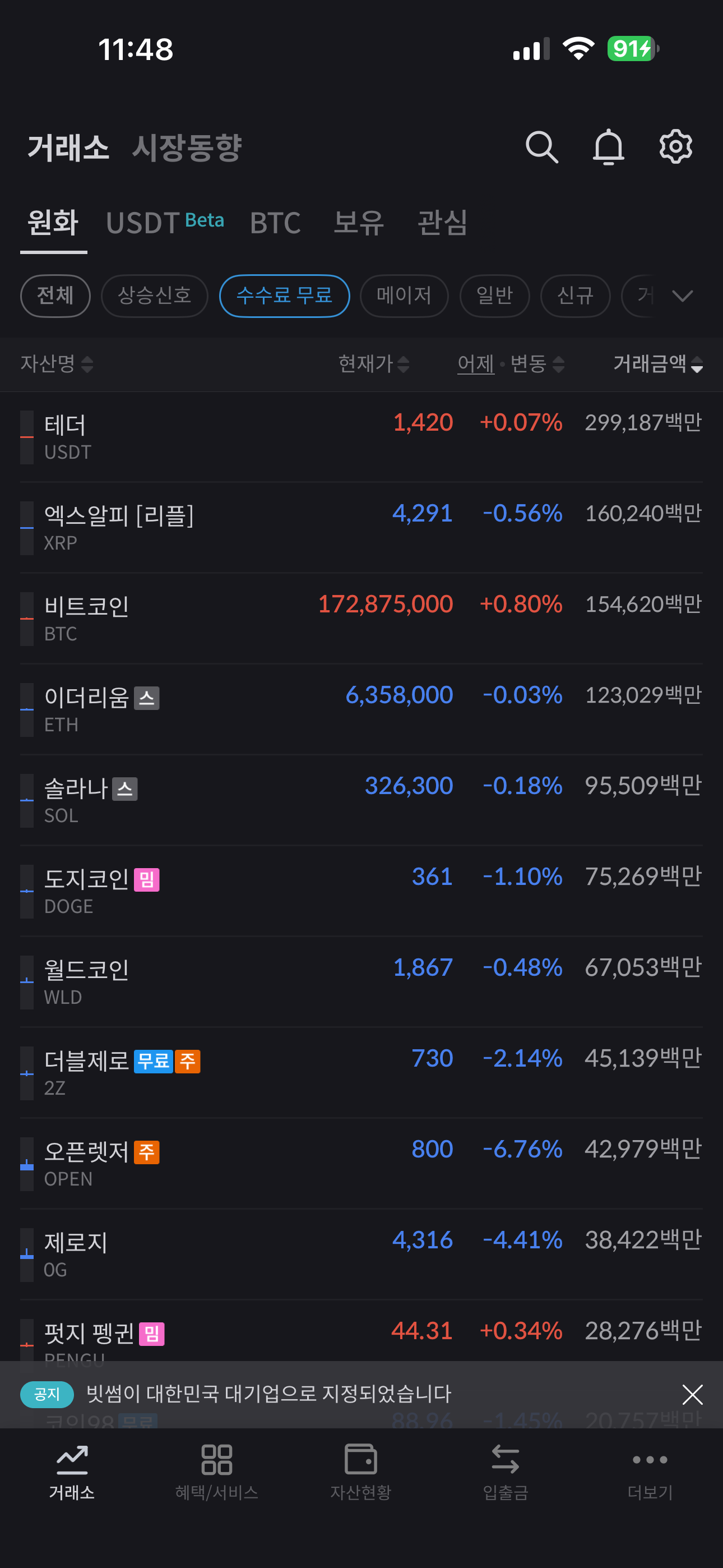 - 국내 원화 입출금이 가장 편리하고, 이용자가 많아 거래량이 안정적입니다.