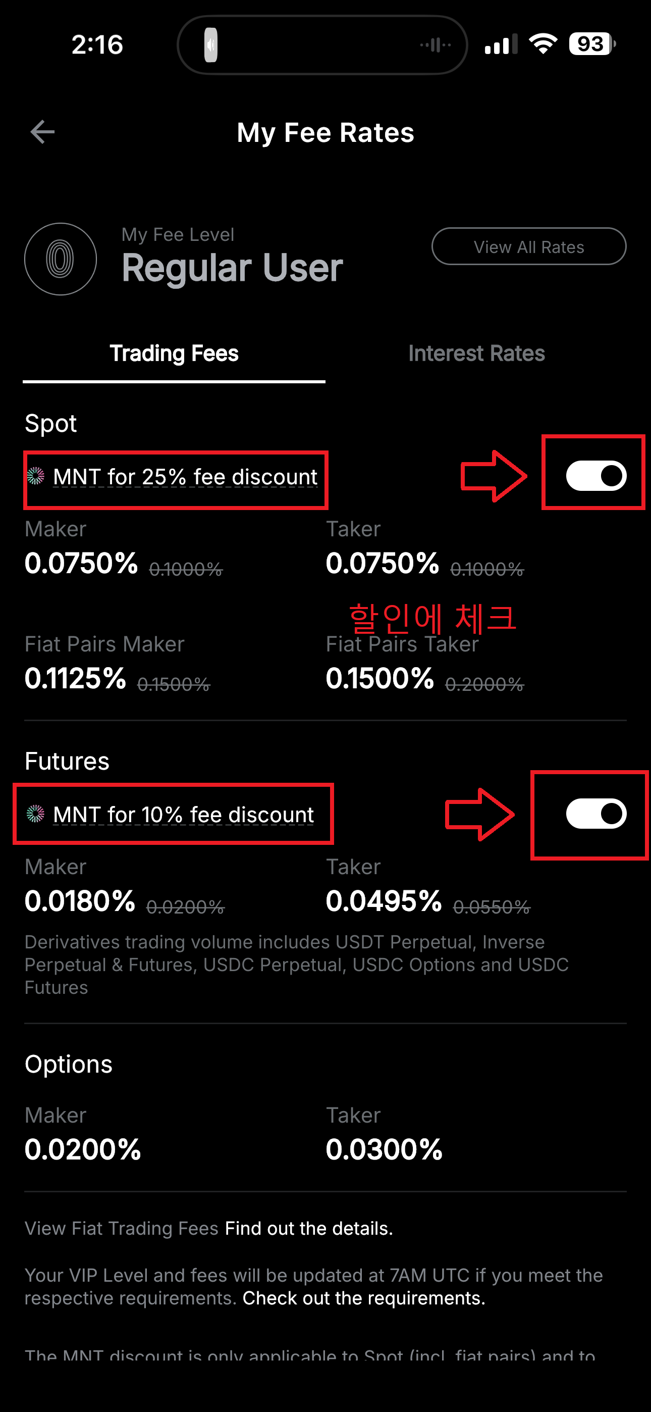 2. MNT 코인 수수료 할인 활성화 (수수료 25%/10% 절감)
