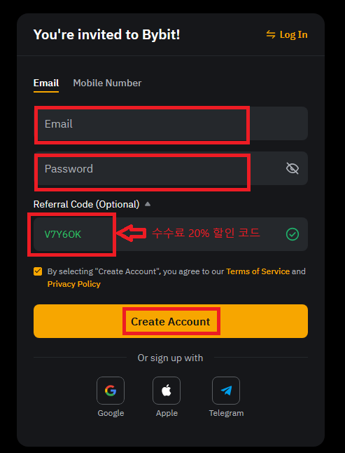- Referral Code(추천인 코드): V7Y6OK 입력 (수수료 20% 할인)