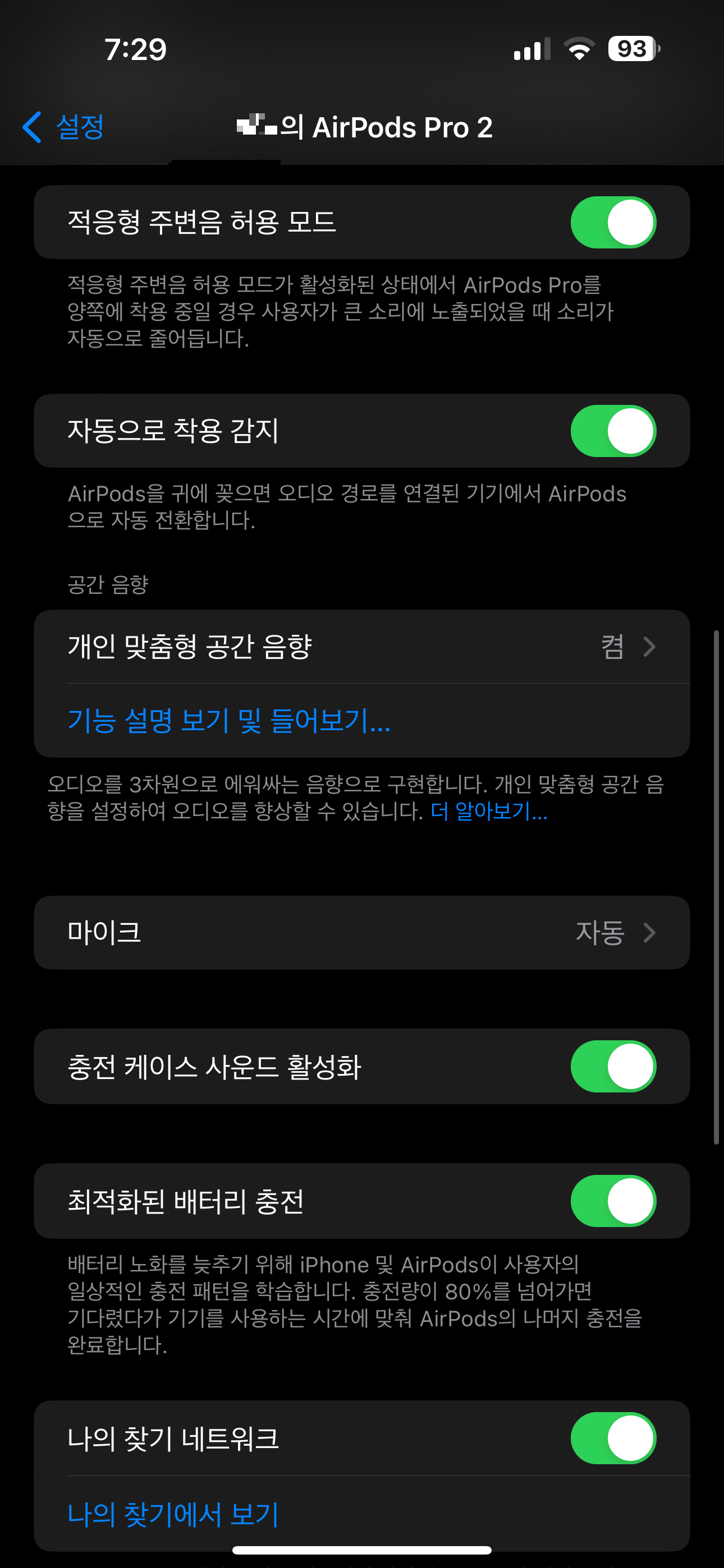 또 하나는 설정입니다. 아이폰 설정에서 에어팟의 수많은 기능들을 컨트롤할 수 있습니다. 새로 생긴 '주변음 허용 모드'를 켜거나 끌 수 있고, 컨트롤 방식을 바꿀 수도 있습니다. 이어팁에 달린 터치바의 반응 속도도 변경할 수 있고, 개인 맞춤형 공간 음향을 통해 사용자에게 맞는 최적의 사운드를 낼 수도 있습니다. 음질도 음질이지만 이러한 설정들이 이어폰의 성능을 더 끌어올렸던 것 같습니다.