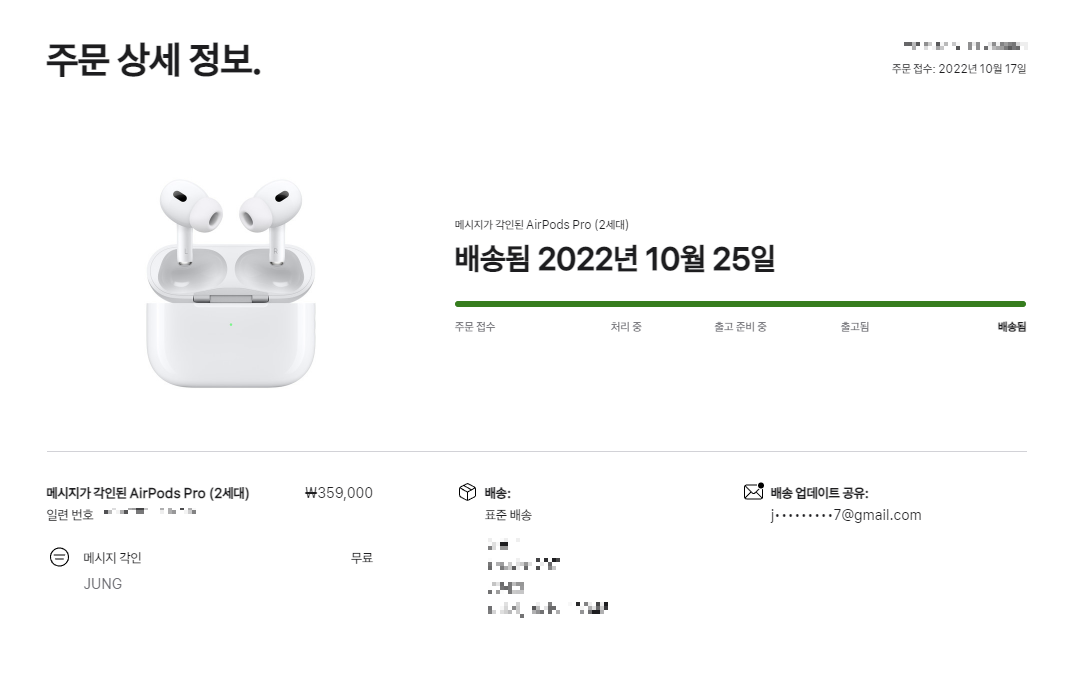 공식 홈페이지에서 주문을 했는데, 이유는 메시지 각인을 새기기 위해서였습니다. (메시지 각인이란 에어팟 케이스에 이모티콘이나 문자를 새기는 커스터마이징 옵션입니다). 에어팟 중앙에 "JUNG"이라고 새겨진 것이 메시지 각인입니다.