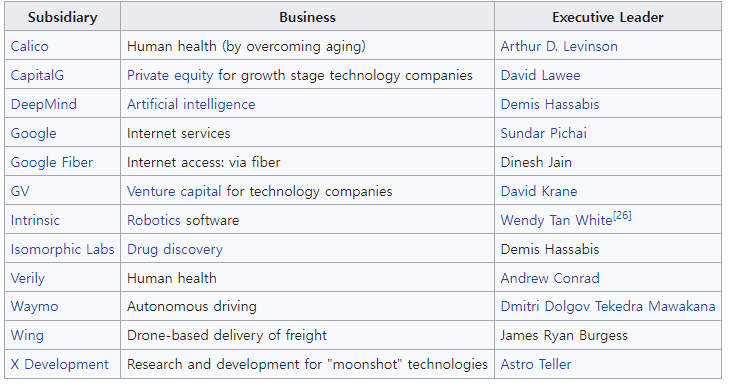 구글의 모기업 알파벳(Alphabet)의 자회사들이다. 인터넷 서비스로 유명한 Google을 포함해 알파고로 유명한 AI의 선두주자 DeepMind, 자율주행으로 유명한 Waymo 등이 있다. 정말 구글의 발전은 끝이 없어 보인다.