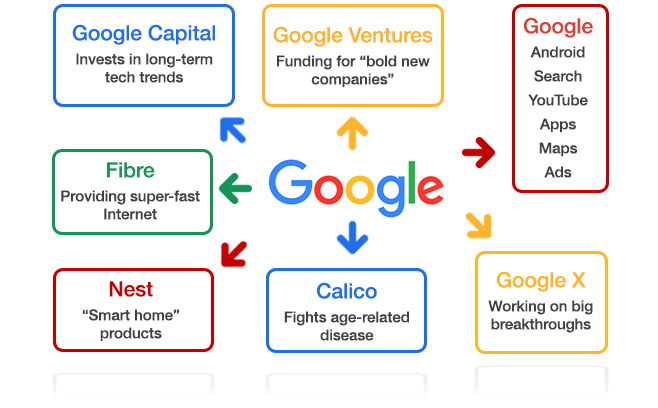 구글을 중심으로 여러가지 자회사들을 키워나가던 구글은 인터넷 서비스 이름인 구글이 다른 사업체들을 대표하기에 적절하지 않다고 생각했다. 구글은 새로운 이름의 필요성을 느끼고 2015년 '알파벳'이라는 새로운 이름을 내세우게 된다.