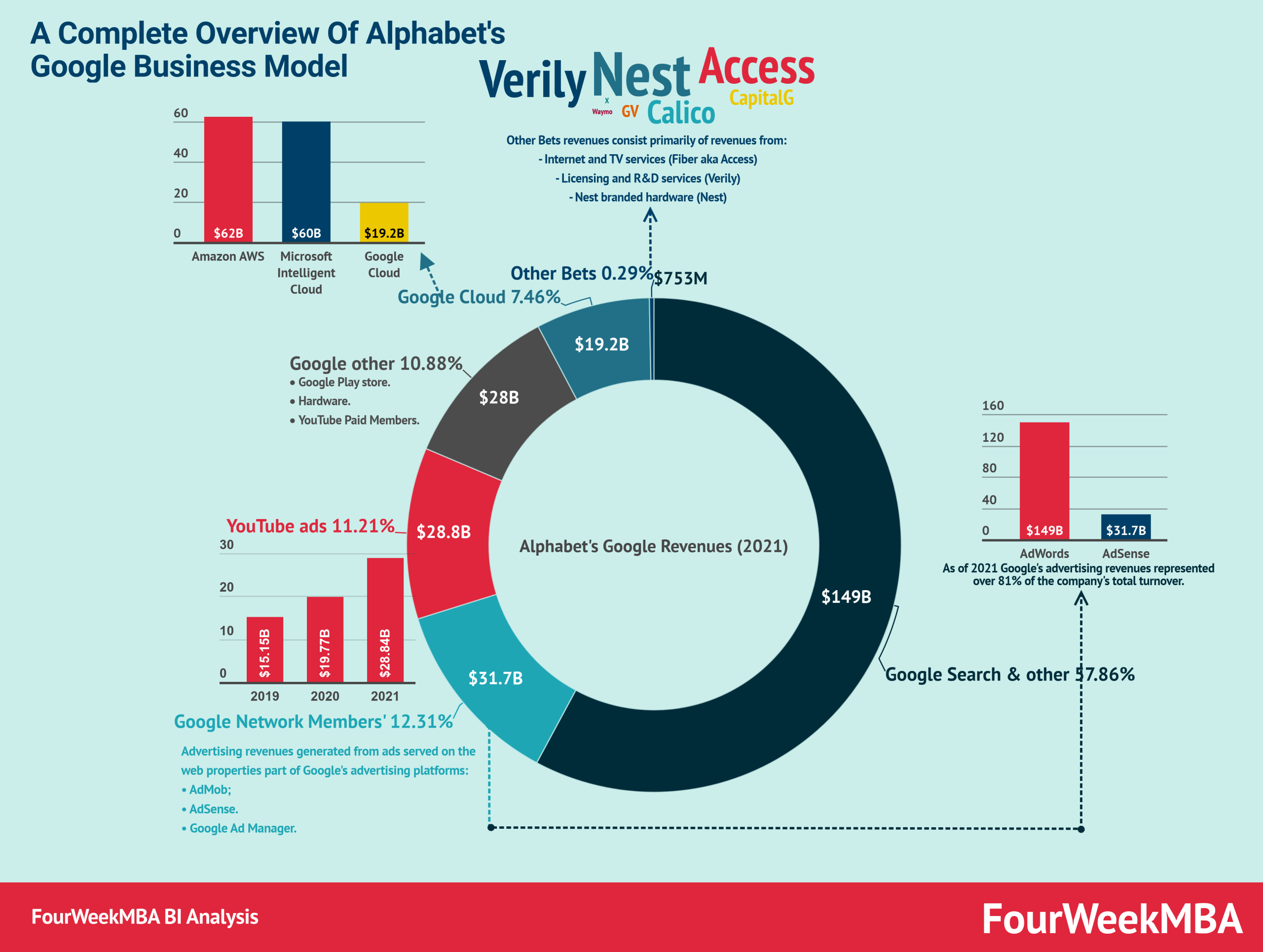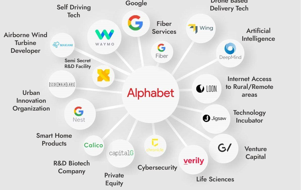 세계적으로 사업이 커나가자 구글은 돈방석에 앉게 되었고 여러가지 밴처기업들을 인수하며 비전을 키워나가게 되었다. 주로 IT 관련 사업들: 자율주행을 담당하는 Waymo, 인공지능의 Deepmind, 생명과학의 Calico, 헬스케어의 Verily 등을 인수했다.