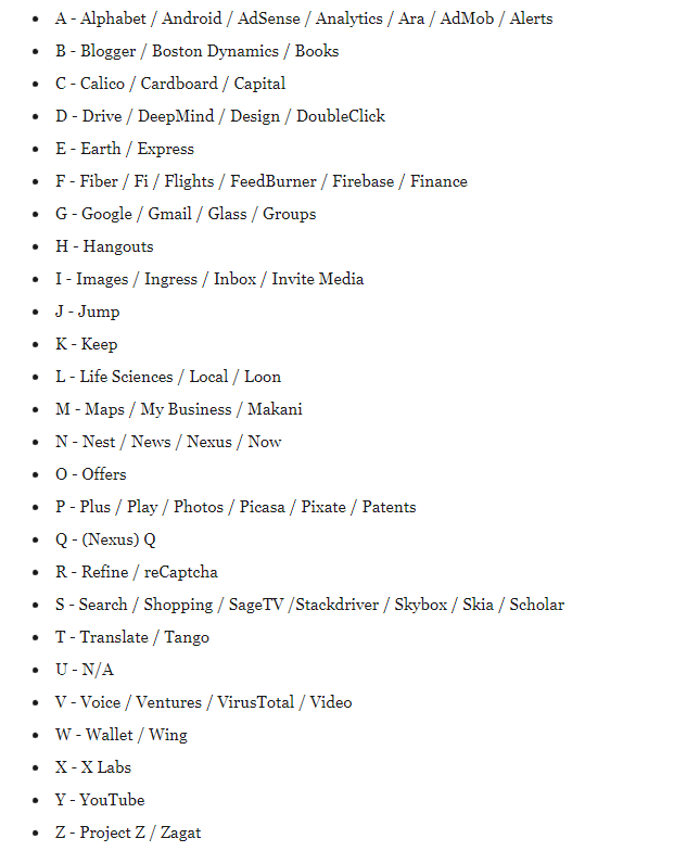영어에서 알파벳은 a,b,c,d,e,f, g..., y, z. 와 같은 문자 체계이다. 구글은 이 알파벳들에 기업이 추구하는 사업의 의미를 담았다. 예를 들면, A는 Android(안드로이드), Adsense(애드센스), B는 Blogger(블로거), Books(책), C는 Calico(칼리코), G는 Google(구글), Y는 Youtube(유투브)등이 있다.
