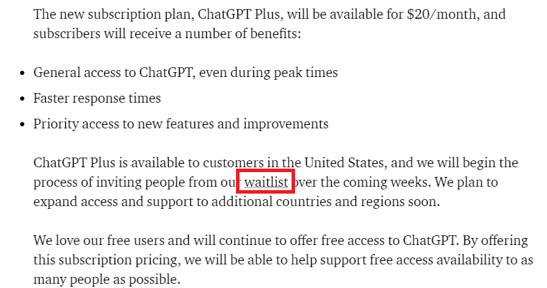 ChatGPT Plus는 미국의 소비자들만 사용할 수 있다. 그리고 Waitlist를 통해 앞으로 몇 주간 ChatGPT Plus 등록을 시작할 예정이다. 앞으로 더 많은 국가들에 지원할 계획을 가지고 있다.