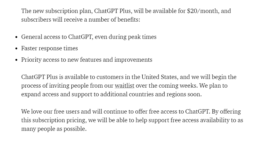 대충 이 정도로 요약 가능할 것 같습니다. 가장 중요한 점은 ChatGPT Plus는 월 20 달러라는 것, 미국에서만 사용 가능하다는 것, 앞으로도 무료 버전 ChatGPT를 제공한다는 것 정도가 있는 것 같습니다.