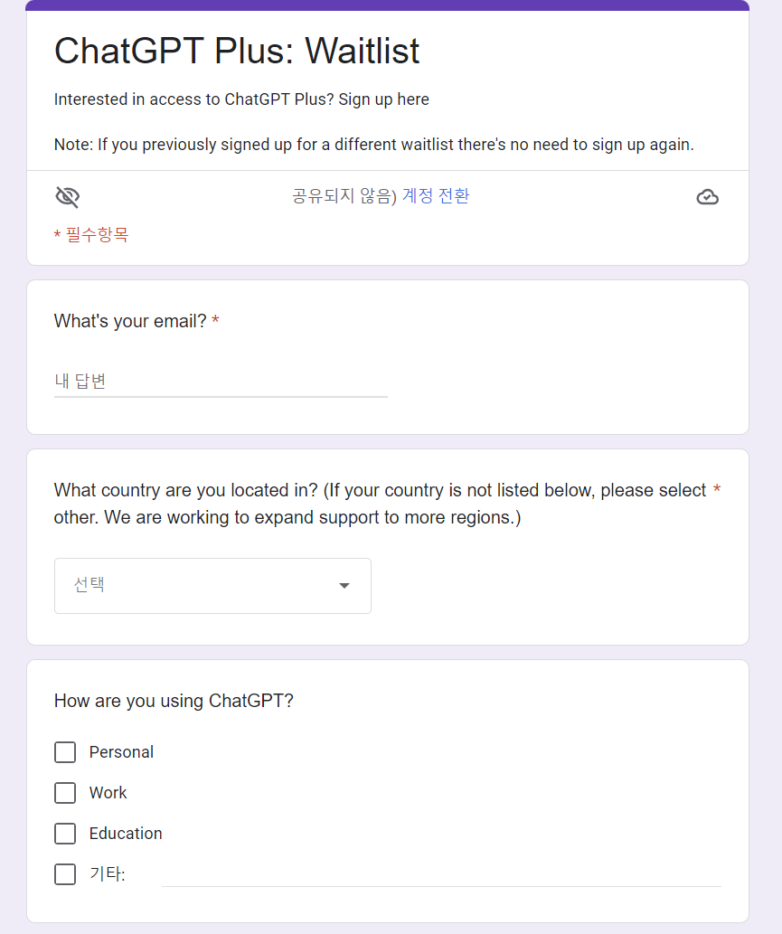 저는 미국에 거주중이진 않지만 앞으로 한국에 ChatGPT Plus가 나온다면 살 생각이 있기에 신청을 해 둔 상태입니다. (Waitlist에 거주 국가를 South Korea로 해 두었습니다). 여러분들도 관심 가시면 ChatGPT Plus Waitlist에 등록을 하면 될 것 같습니다.