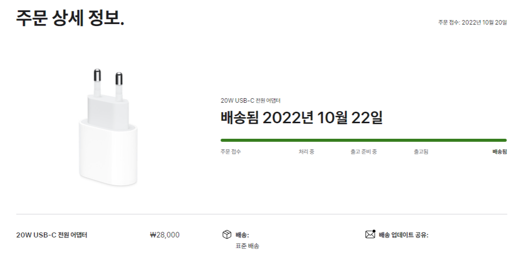 애플의 정품 충전기, 정식 명칭으로는 "20W USB-C 전원 어댑터"이다. 가격은 28,000원 정가를 주고 구입하였다. Apple 공식 홈페이지에서 배송 주문하였는데 배송까진 하루 이틀정도 걸렸던 것 같다.