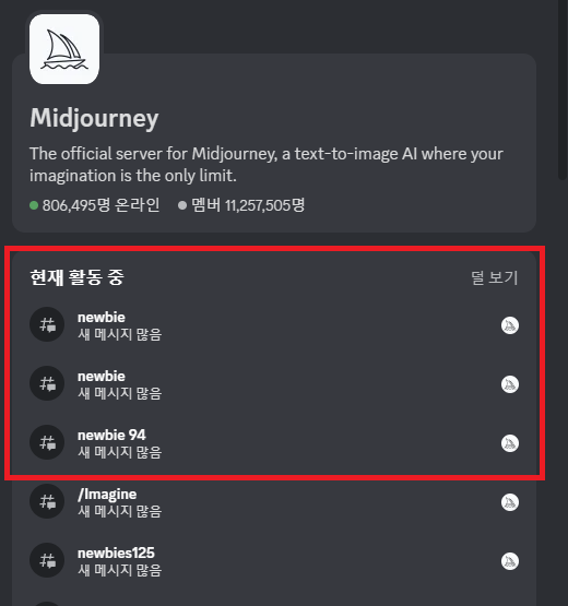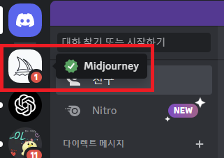 디스코드 초대를 수락해 주면, 밑에 화면과 같이 디스코드에 미드저니 채널이 추가될 것이다.