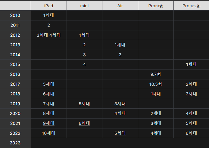 아이패드는 세대(Generation)로도 구분됩니다. 밑에 표 참고하시면 좋을 것 같습니다.